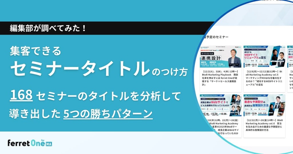 集客できるセミナータイトルのつけ方|当社168セミナーのタイトルを分析して導き出した5つの勝ちパターンノウハウ編集部が調べてみた2025-12-08 00:58(更新:2025-12-19 03:11)ferret One for MA