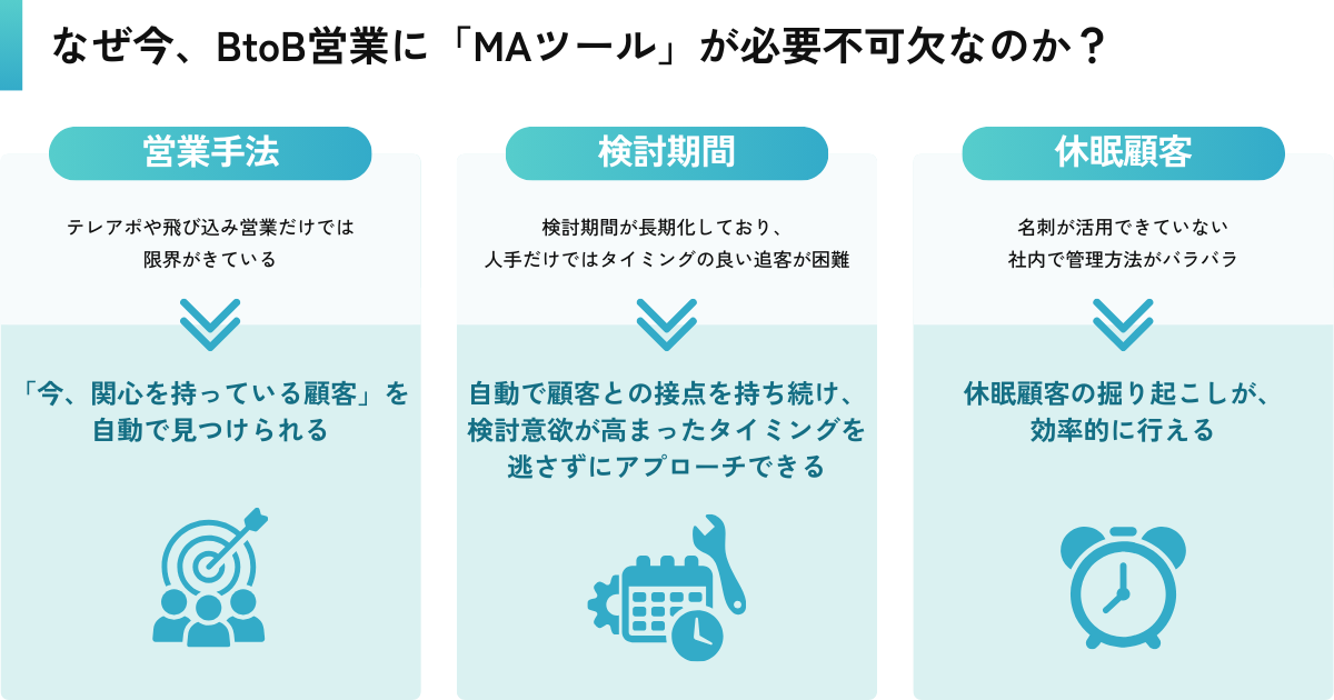 MAツールというと、BtoC向けのイメージが強いかもしれません。しかし実際には、「BtoB向け」を明確に打ち出しているMAツールも数多く存在しています。それでは、なぜ今、BtoB営業においてMAツールが必要不可欠になっているのでしょうか。