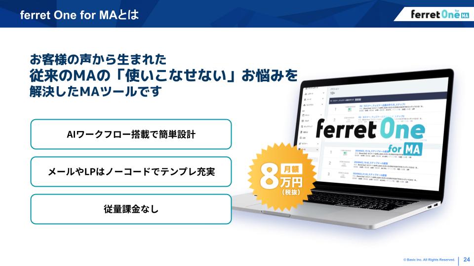 株式会社ベーシックが提供する、BtoBマーケティングに必要な機能をオールインワンで搭載したMAツール。「使いこなせないMA」の課題を解決するため、月額8万円からというコストパフォーマンスと、誰でも使いこなせるシンプルな操作性を追求。Webサイト(CMS)とMAがシームレスに連携し、リード獲得からナーチャリング、データ分析までを一気通貫で実行できる。