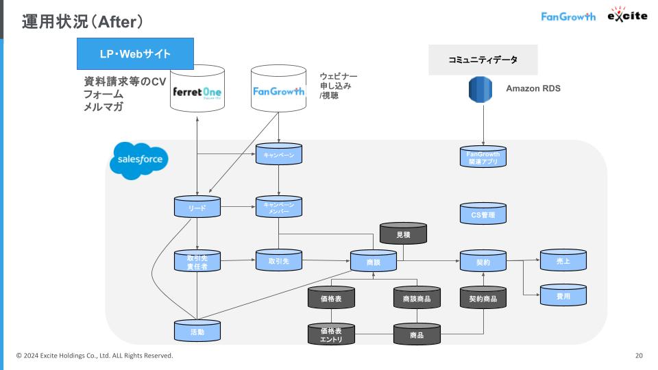 大熊氏:マーケツールは基本的にSalesforce、ferret One for MA、FanGrowthの3つで完結する形を想定しています。データ基盤がようやく整った、というのが今回の一番大きいところですね。
