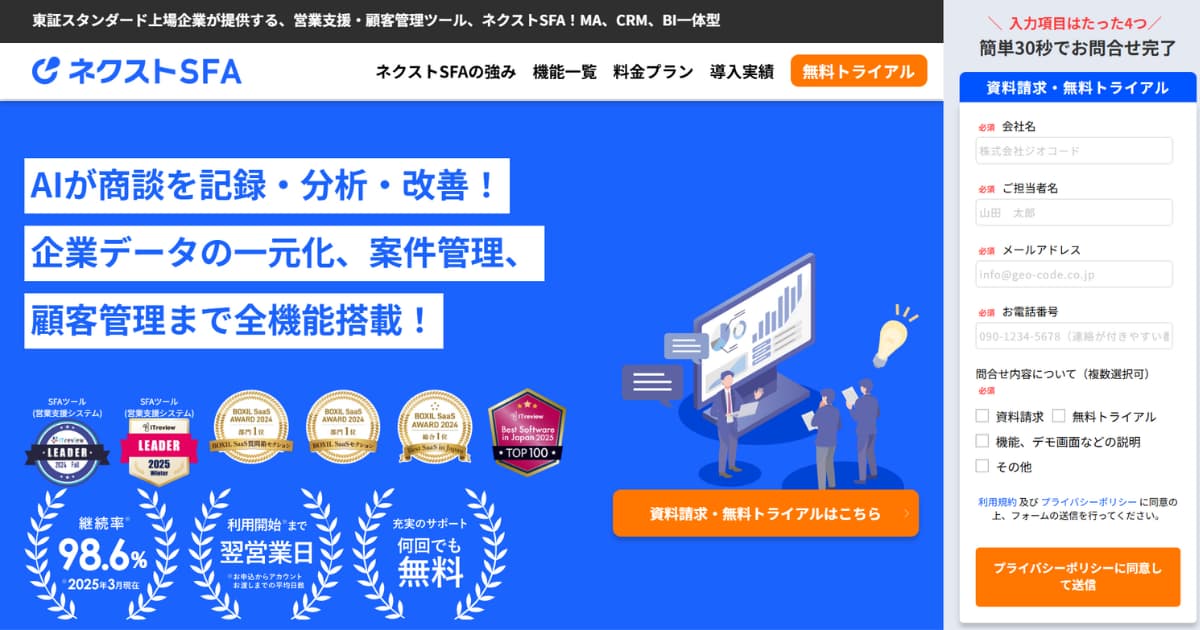 ネクストSFAは、「導入コスト」と「サポートの手厚さ」を重視する中小企業に最適な国産SFAです。