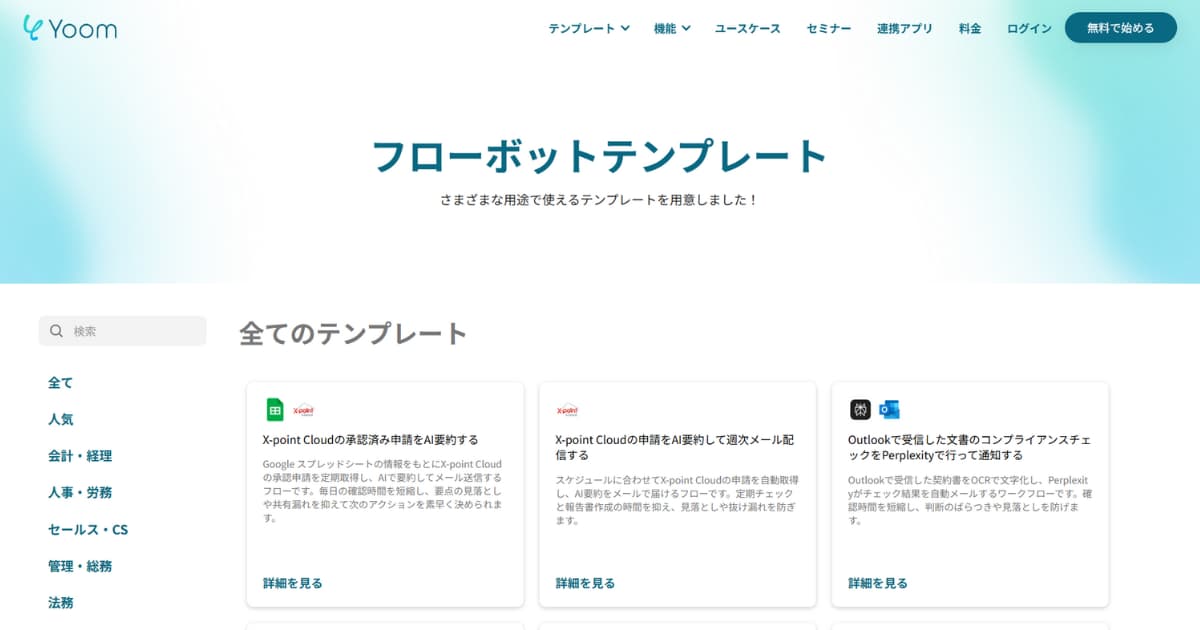 Yoomは、フローボット・データベースともに多くの「テンプレート」が用意されています。