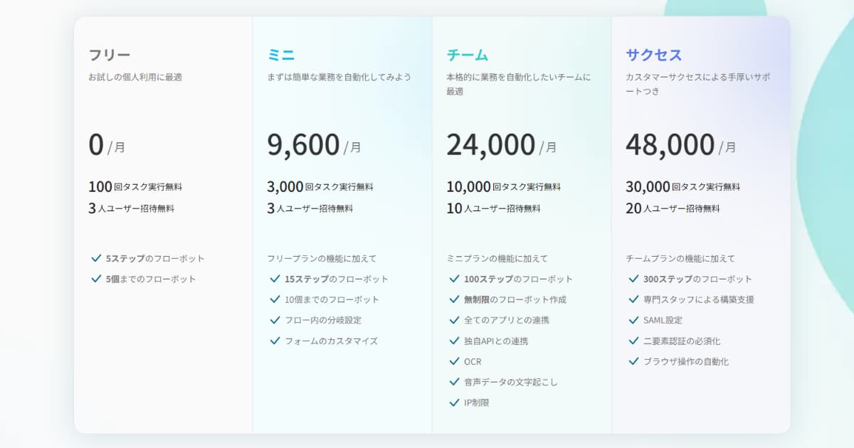 フローボット数や実行できるタスク数、連携できるツールの種類、機能もプランによって変わります。