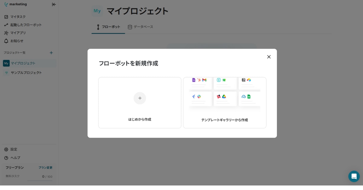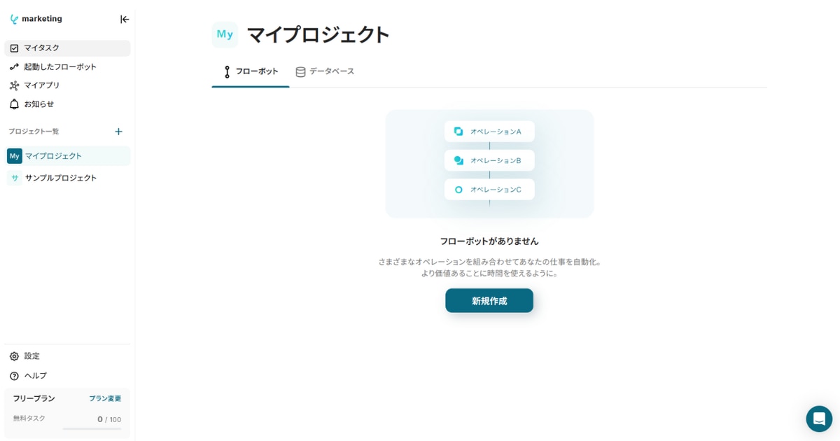 プロジェクトとは、管理画面内にあるフォルダのような機能です。 プロジェクトごとでフローボットとデータベースを管理することができます。