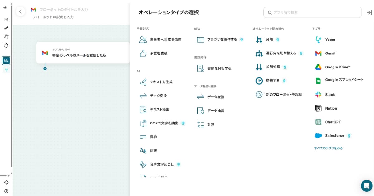 フローボットについては「請求書発行を自動化」「面接日程調整を自動化」など、業種ごとに日本のビジネスシーンで頻出する業務フローがテンプレート化されており、それを選ぶだけで基本設定が完了します。