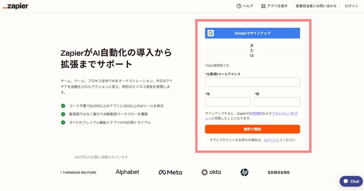 Zapier公式サイトにアクセスし、メールアドレスやGoogle/Microsoftアカウントでサインアップします。無料プランで開始できます。