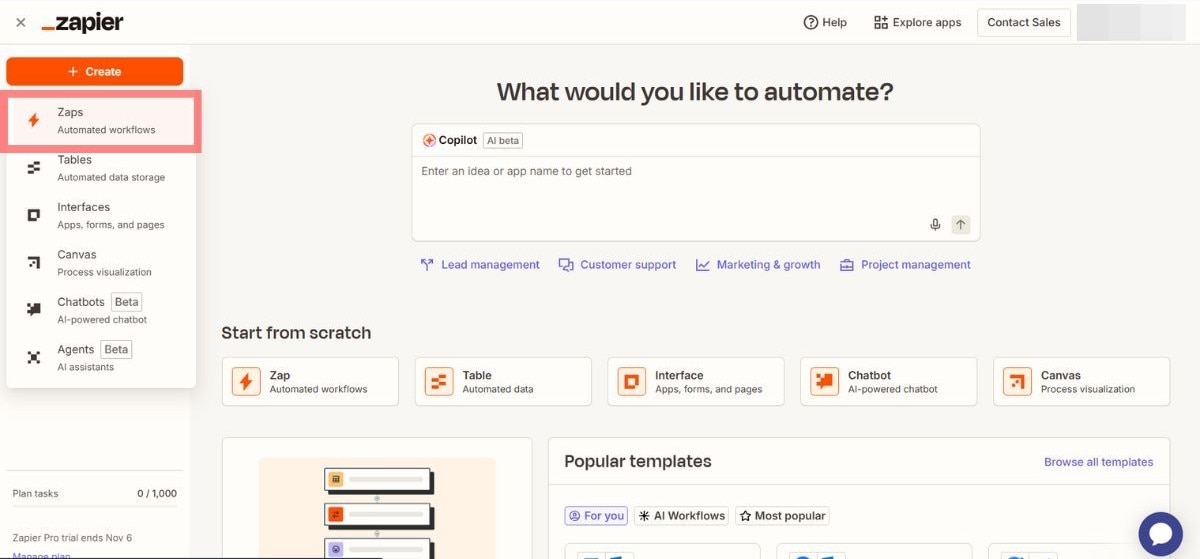 ログイン後、ダッシュボードの「Create」>「Zap」ボタンをクリック。