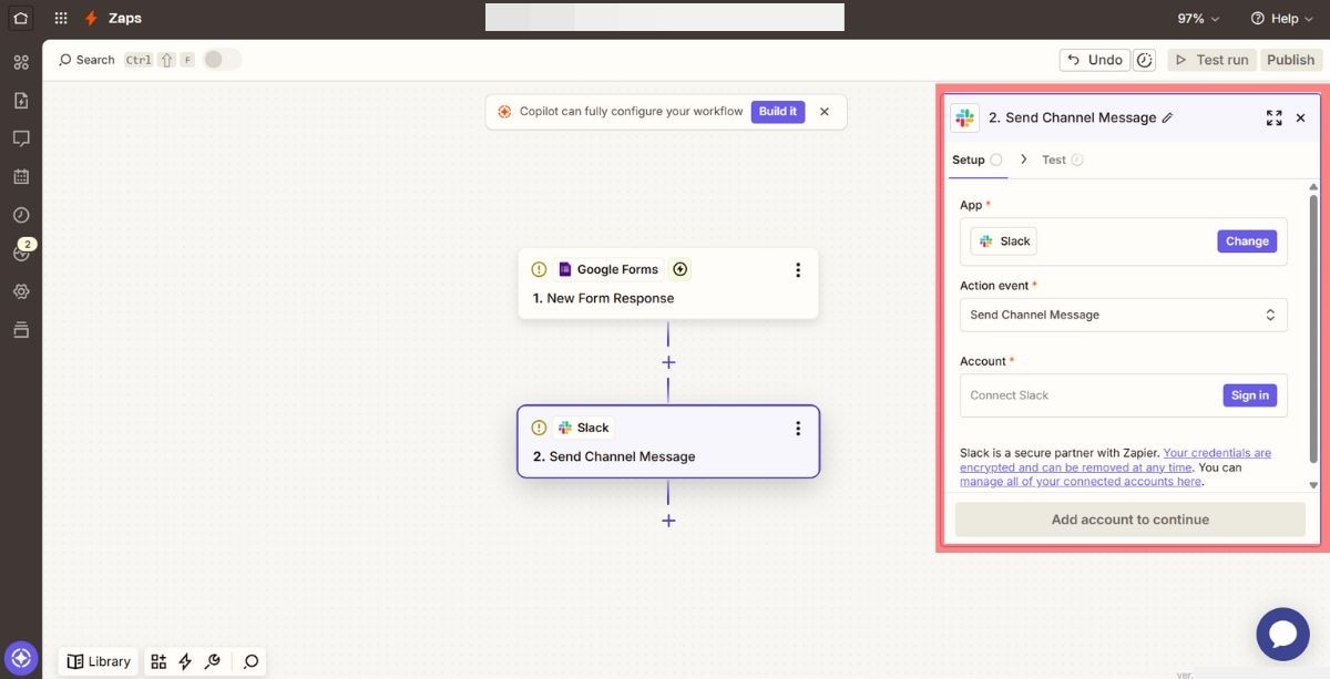 - Message Text:Slackに投稿するメッセージ内容を編集します。ここで、ステップ3(トリガー)で取得したGoogleフォームの回答データを挿入できます。(例:「【新規問合せ】会社名:[フォームの会社名データ], お名前:[フォームの氏名データ]」のように設定します)