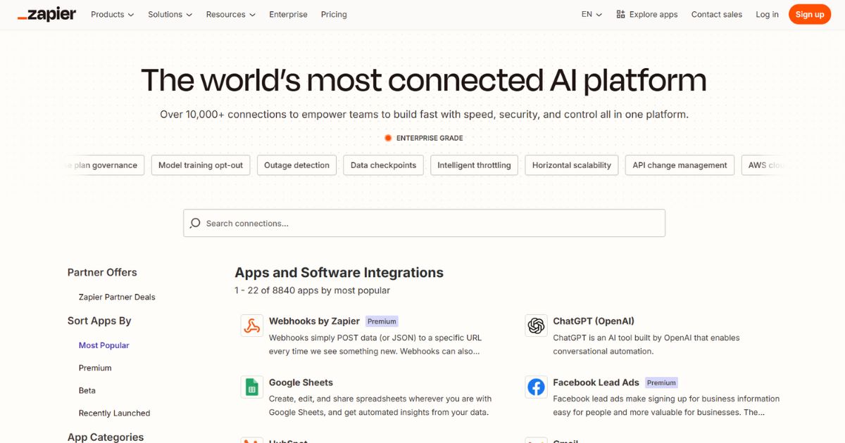 Zapierの最大の強みは、その圧倒的な連携アプリ数です。2025年10月現在、8,000種類以上のWebアプリケーションと連携が可能です。(公式サイトより)