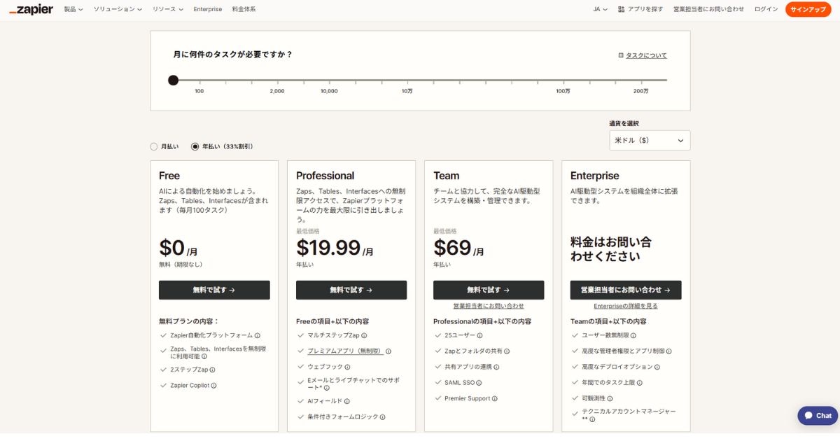 Zapierは無料から利用可能。有料プランは$69~/月。プランによって使える機能、タスク数、Zap数が異なる。