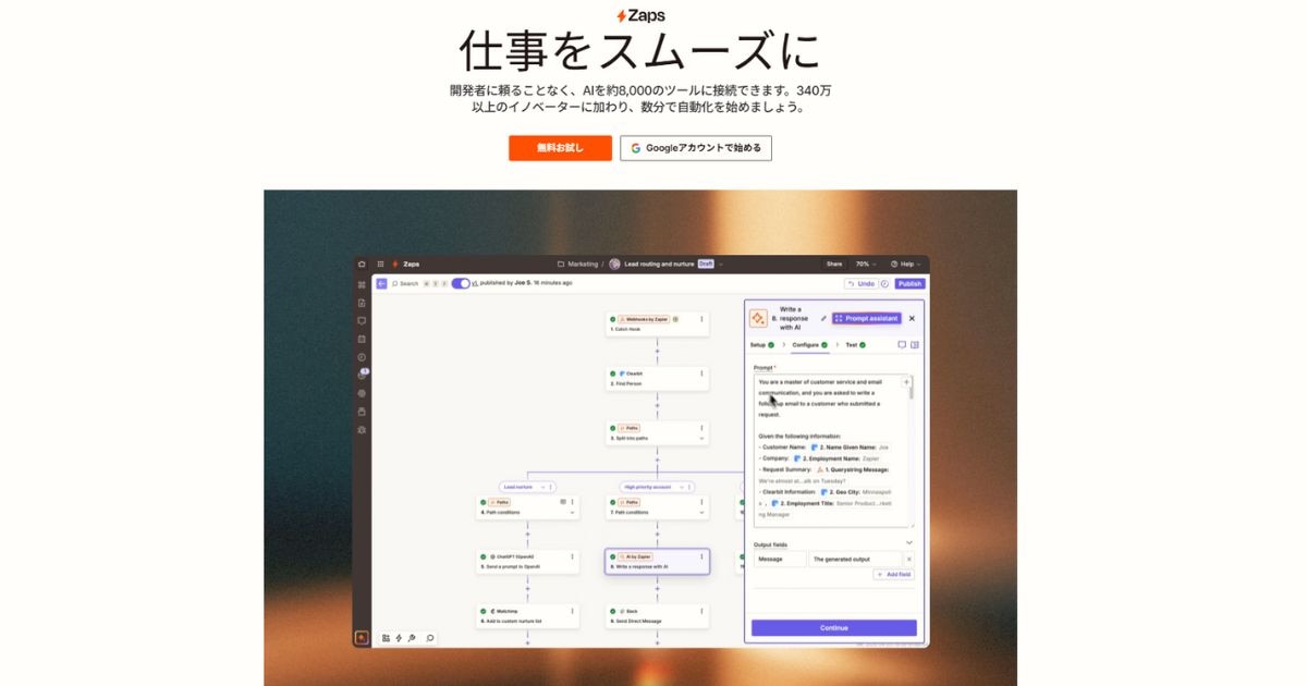 Zapierは、プログラミング知識がなくても、日常的に使用している複数のSaaS(クラウドサービス)を連携させ、一連の業務を自動化できる「iPaaS(Integration Platform as a Service)」と呼ばれるツールの一つです。