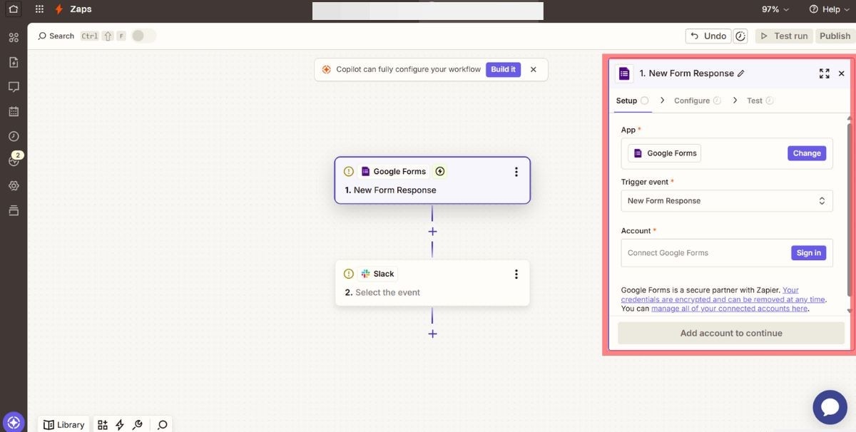 - Account(アカウント):ZapierからGoogleアカウントへの連携を認証します。