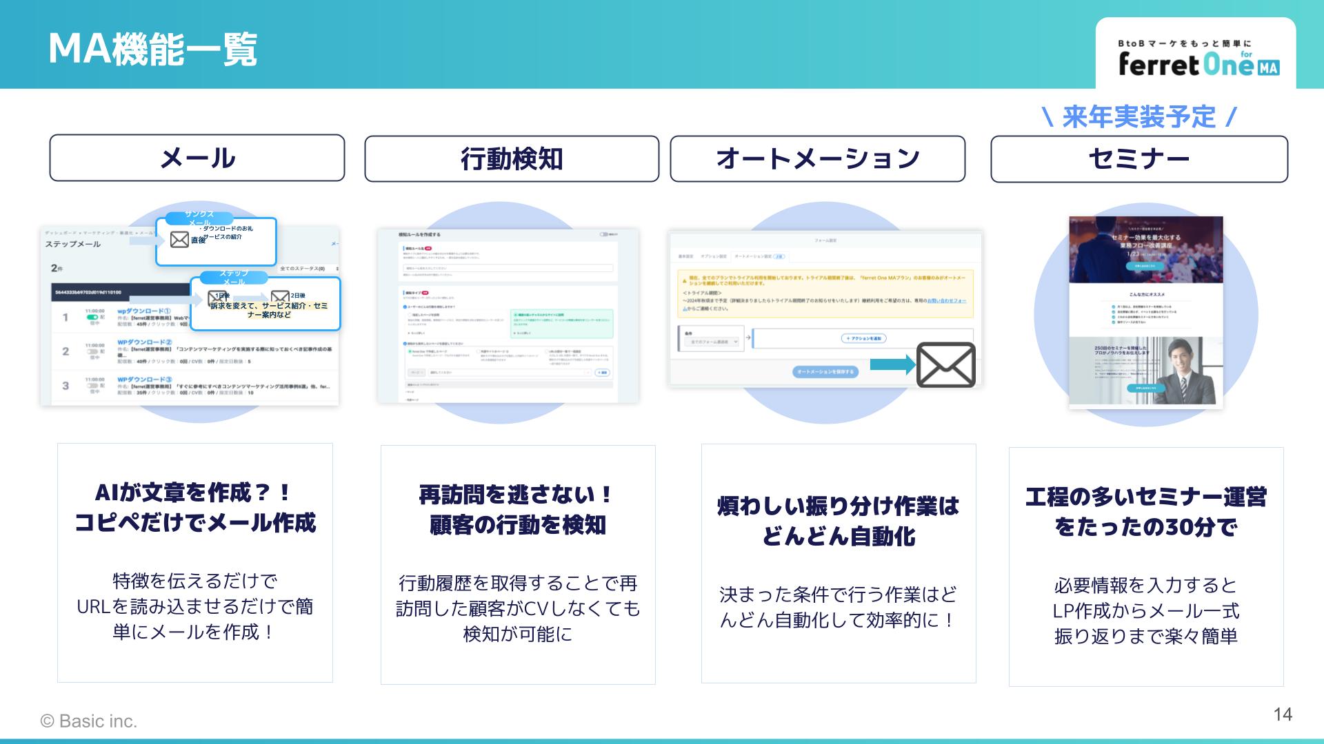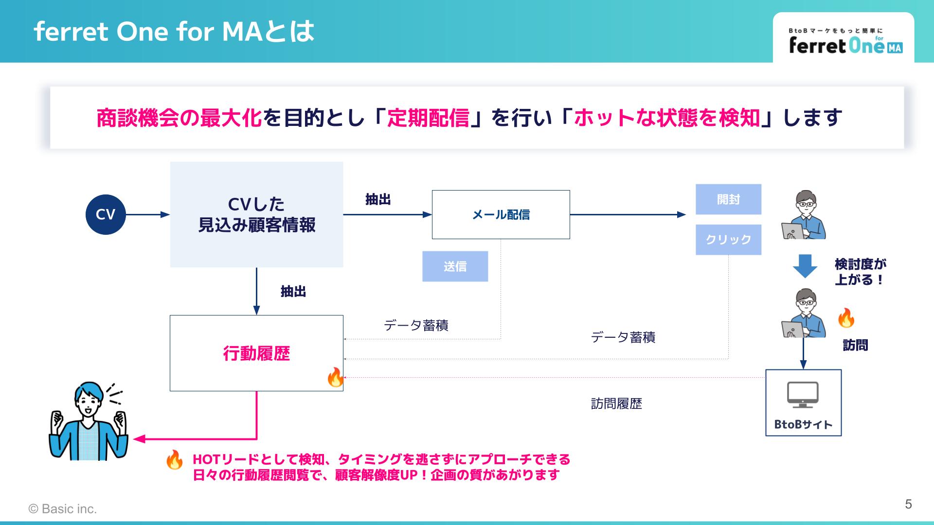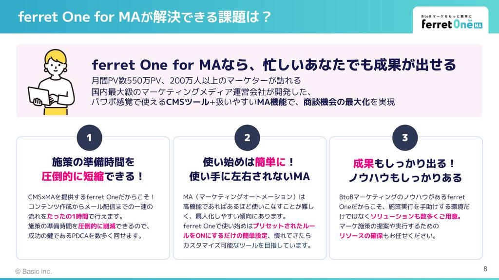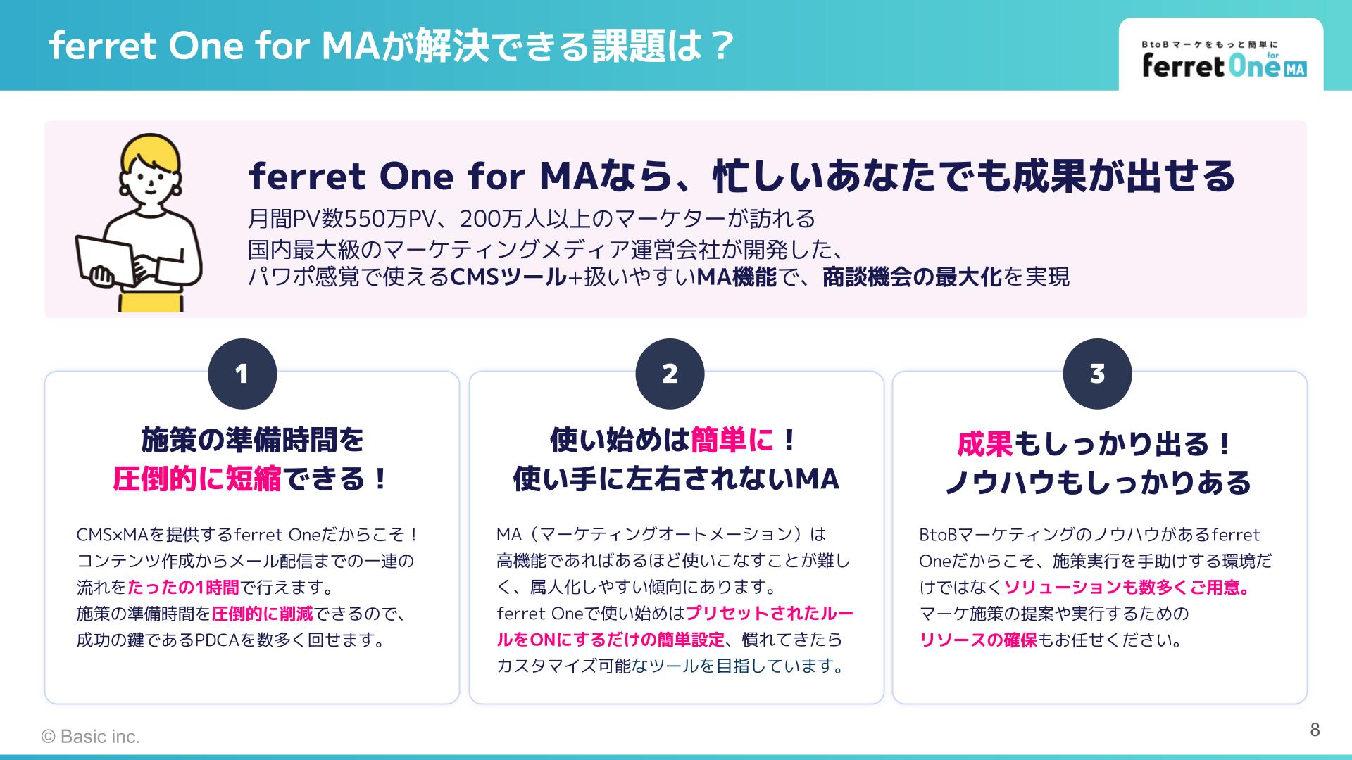 「ferret One for MA」のご紹介です。 「MAを導入したけど、使いこなせない」とお悩みではありませんか? ferret Oneは、BtoB施策に必要な機能を、現場のマーケター・営業が使いやすい形で搭載。 複雑な設定不要で、顧客管理・メール送信・行動検知が始められます。