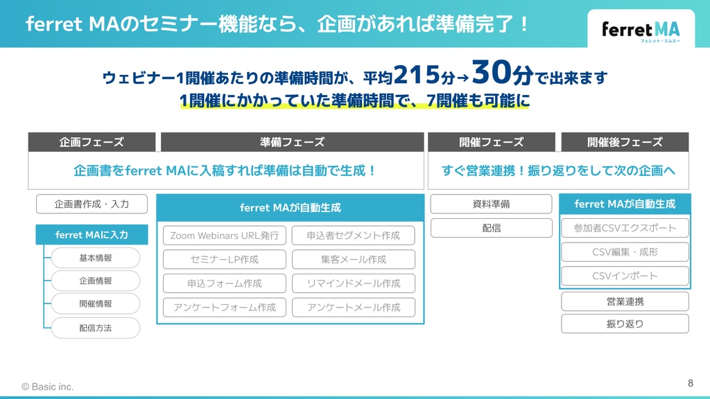 「ferret MA」のセミナー機能のご紹介です。 企画書の内容をいれるだけ!わずか30分でセミナー準備が完了! 作業工程の多いセミナーの運営から振り返りまでの業務を圧倒的に効率化します。