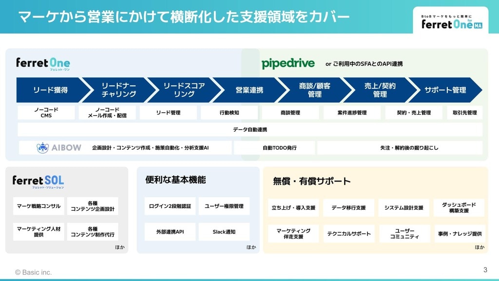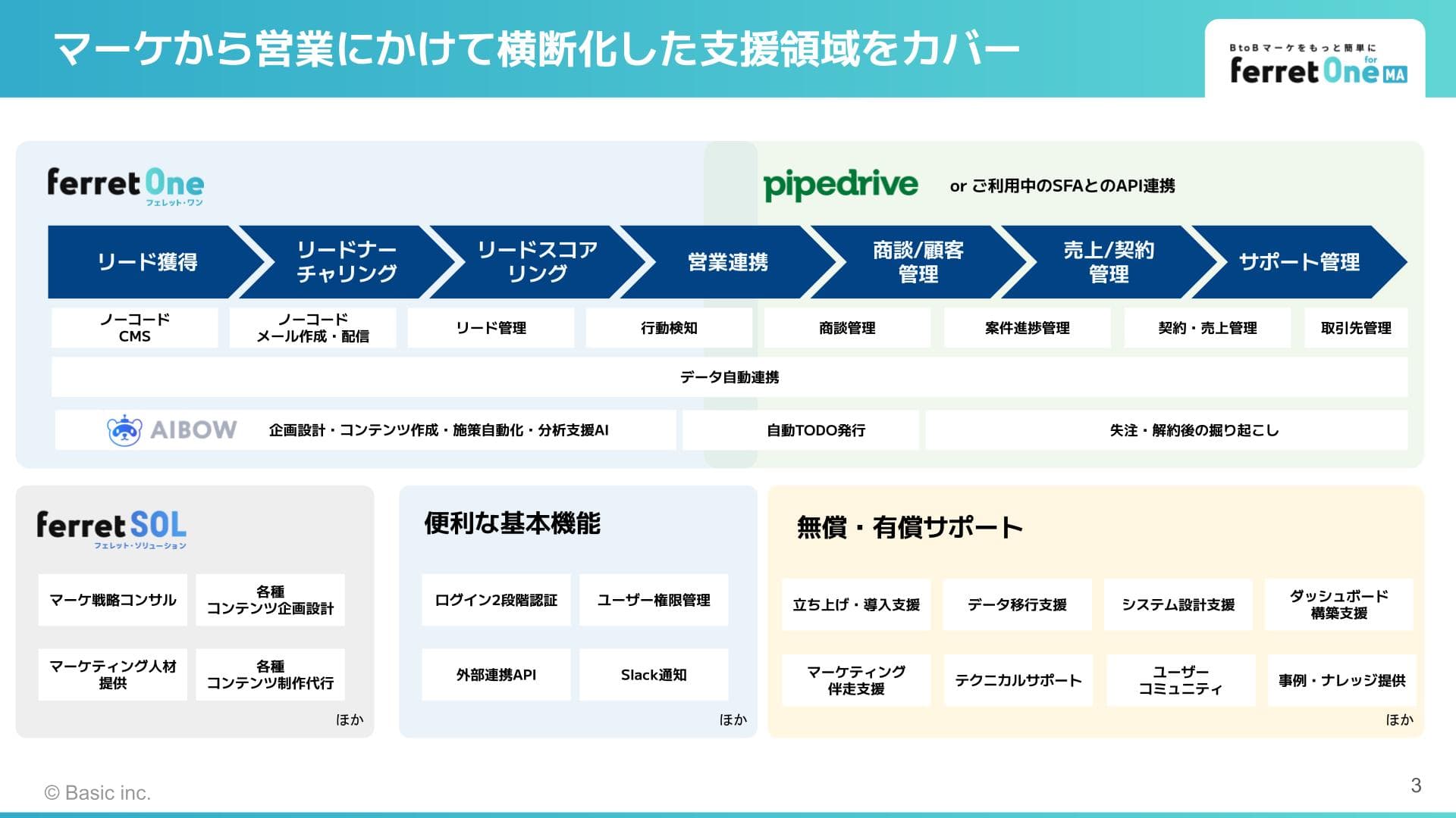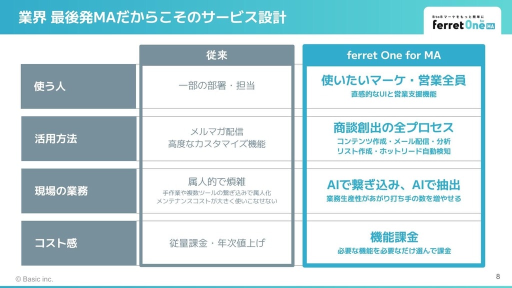 「ferret One for MA」のご紹介です。 「MAを導入したけど、使いこなせない」とお悩みではありませんか? ferret Oneは、BtoB施策に必要な機能を、現場のマーケター・営業が使いやすい形で搭載。 複雑な設定不要で、顧客管理・メール送信・行動検知が始められます。