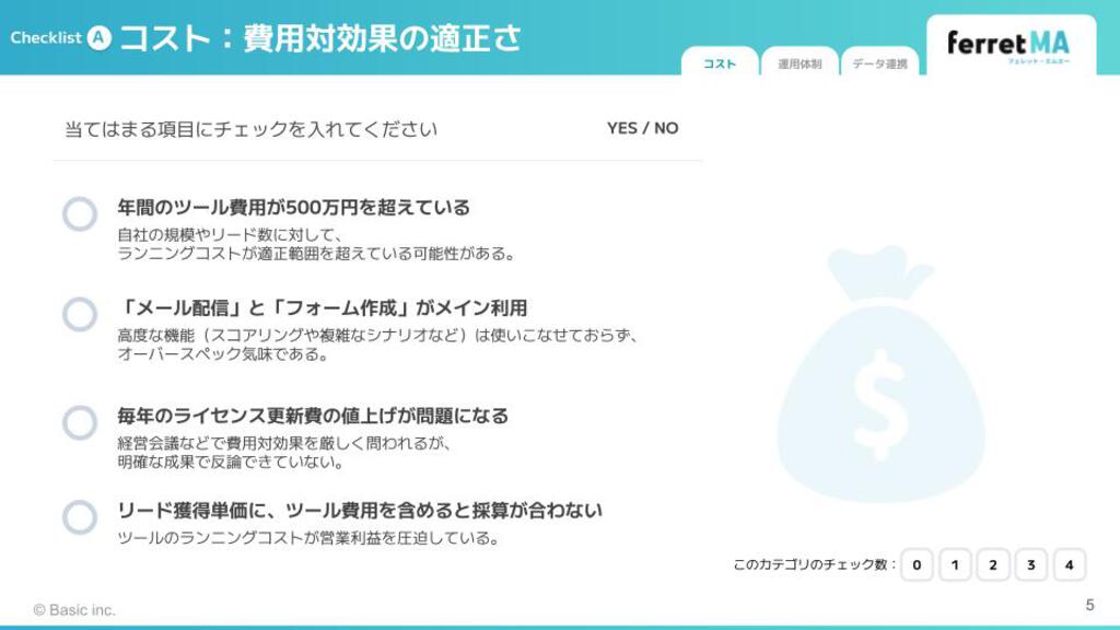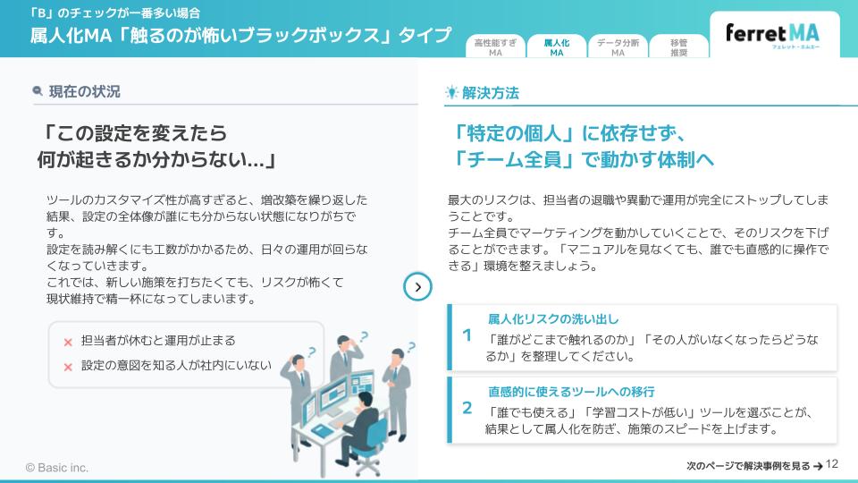 本シートでは、たった12問のチェックリストに答えるだけで、貴社のMA運用の現状を4つのタイプに分類・診断します。