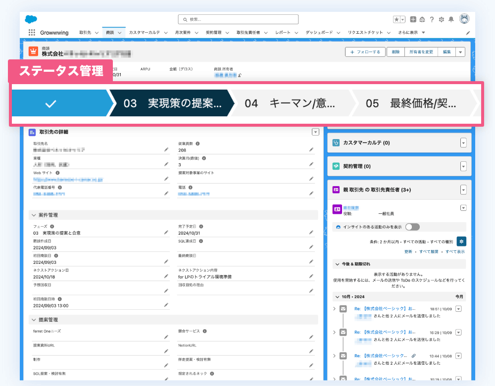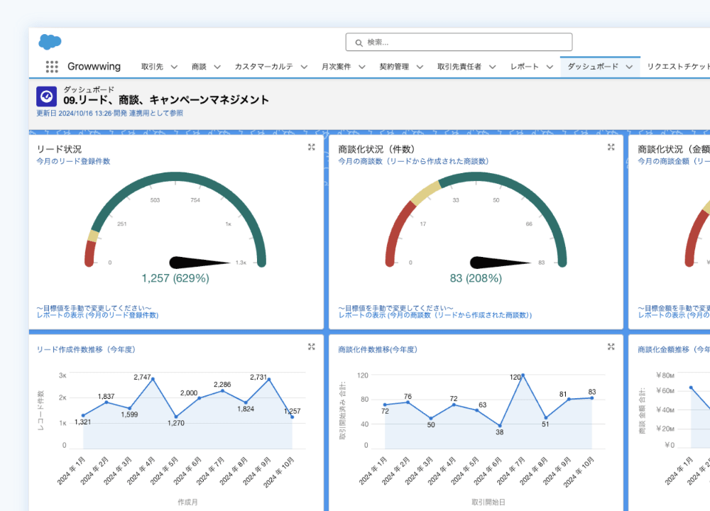 Salesforceで顧客データを一元管理し、顧客の取引履歴や連絡先情報をリアルタイムで共有。可視化された営業情報をもとに、顧客の最新状況を即座に把握できるようにし、対応の迅速化を実現。