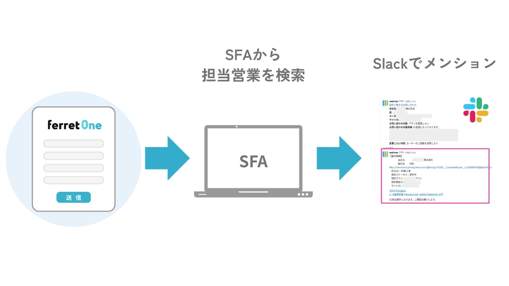 Salesforceなど、お使いのSFAと連携することで、お問い合わせ内容から自動的に担当営業を特定し、既存顧客か新規顧客かを判別。結果をチャットツールにて担当者へ即時に通知します。